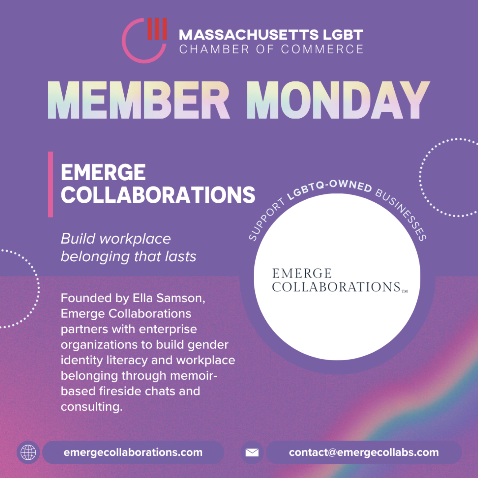 Emerge Collaborations was featured in the Massachusetts LGBT Chamber of Commerce's Member Monday newsletter, spotlighting the firm's work and the upcoming launch of The Power of Emergence.